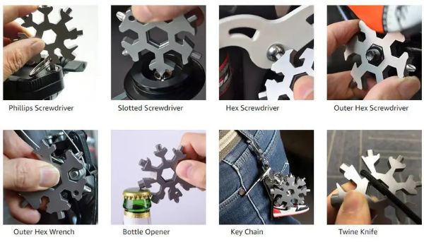 MULTIFLAKE può essere utilizzato per aprire la bottiglia di birra, girare le viti, fissare snowboard, bicicletta, giocattoli e altro ancora.