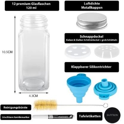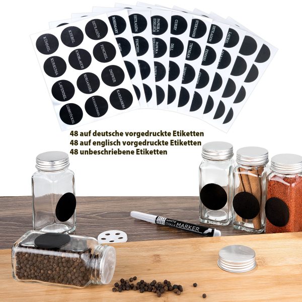- ETICHETTI LE SUE SPEZIE COME UN PROFESSIONISTA! – Il set di barattoli per spezie con coperchio comprende anche 48 etichette con i nomi delle spezie più comuni in francese e tedesco e 48 etichette neutre su cui potrà scrivere con la penna a gesso inclusa.