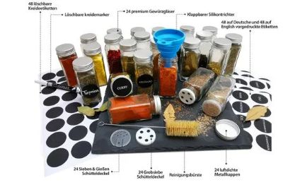 Non riceverà solo 24 fantastici barattoli per spezie, ma un set completo in cui troverà tutto ciò che le serve. Sono incluse 48 etichette adesive rotonde prestampate con i nomi delle spezie in tedesco, 48 etichette adesive rotonde prestampate con i nomi delle spezie in francese e 48 etichette adesive rotonde neutre su cui potrà scrivere con la penna a gesso di alta qualità inclusa.