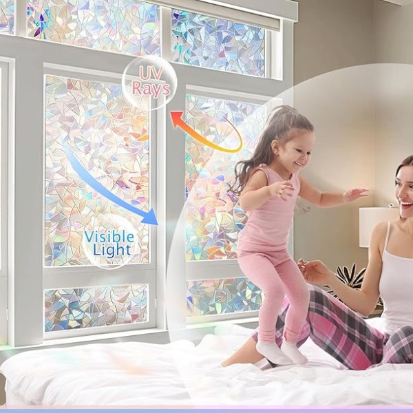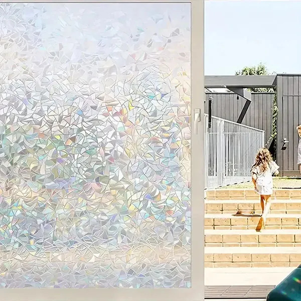 Quando la luce del sole colpisce la pellicola, crea un arcobaleno ipnotico di colori in tutta la stanza, senza bloccare la luce naturale. Questa pellicola si adatta bene a qualsiasi ambiente – soggiorni, bagni, uffici e persino porte in vetro – ed è quindi una soluzione universale per spazi diversi.