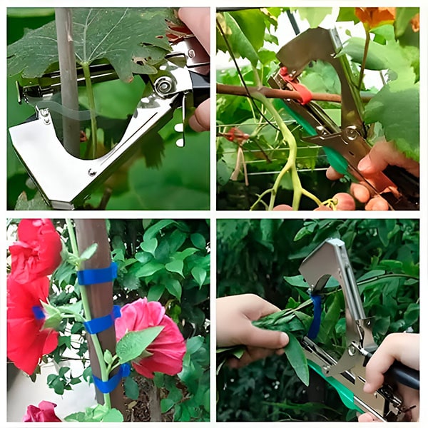 Basta spingere la maniglia per allungare la cinghia tra le pinze. Il nastro viene quindi avvolto attorno alla pianta che vuoi legare. Spingere nuovamente la maniglia per tendere e tagliare il nastro. Molto facile! – nessuna preoccupazione di danneggiare le tue piante o di causare loro dolore, poiché il nastro e la cucitrice forniscono una presa delicata ma salda.