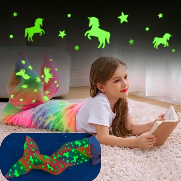 La coperta MERMAIDREAM si illumina al buio, fornendo una luce calmante per alleviare le paure notturne. Basta esporla alla luce del giorno per 20 minuti e si illuminerà dolcemente per tutta la notte. Scegliete il design a coda di squalo o a coda di sirena per aggiungere magia al sonno del vostro bambino.
