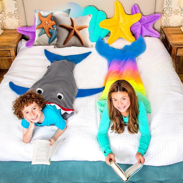 Scegliete tra la coperta a coda di squalo o a coda di sirena. Ideale per bambini energici che amano giocare e fingere, questa coperta soddisfa il loro lato selvaggio tenendoli al caldo.