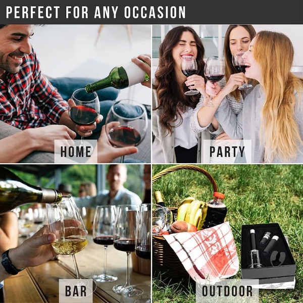 Questo set 4-in-1 include un apribottiglie a pompa d’aria, un tagliacapsule, un aeratore versatore e un tappo sottovuoto per un’esperienza del vino impeccabile.